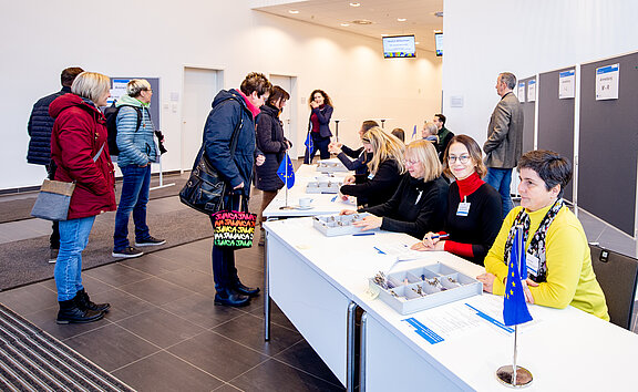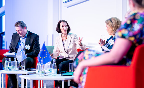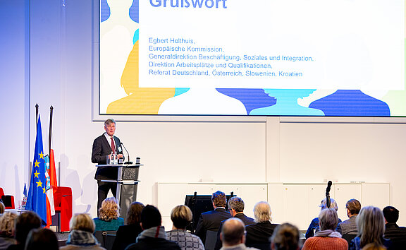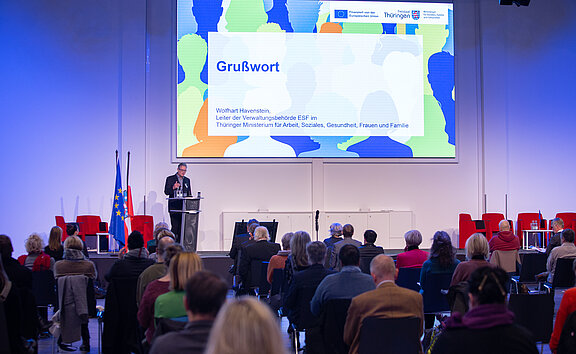 Die Begrüßung der Teilnehmenden erfolgte durch Wolfhart Havenstein als Leiter der Verwaltungsbehörde ESF. Anschließend richteten Heike Werner (Thüringer Ministerin für Arbeit, Soziales, Gesundheit, Frauen und Familie) und Egbert Holthuis (Europäischen Kommission) ihre Grußworte an die Teilnehmenden.